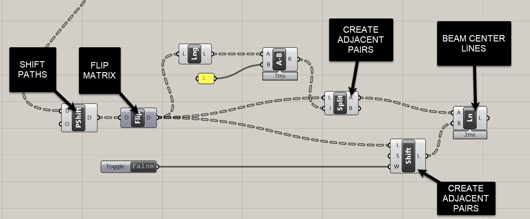 -1with Wrap = False → output gives items2..n - Use Line (start = A, end = shifted list) to create the beam centerlines.