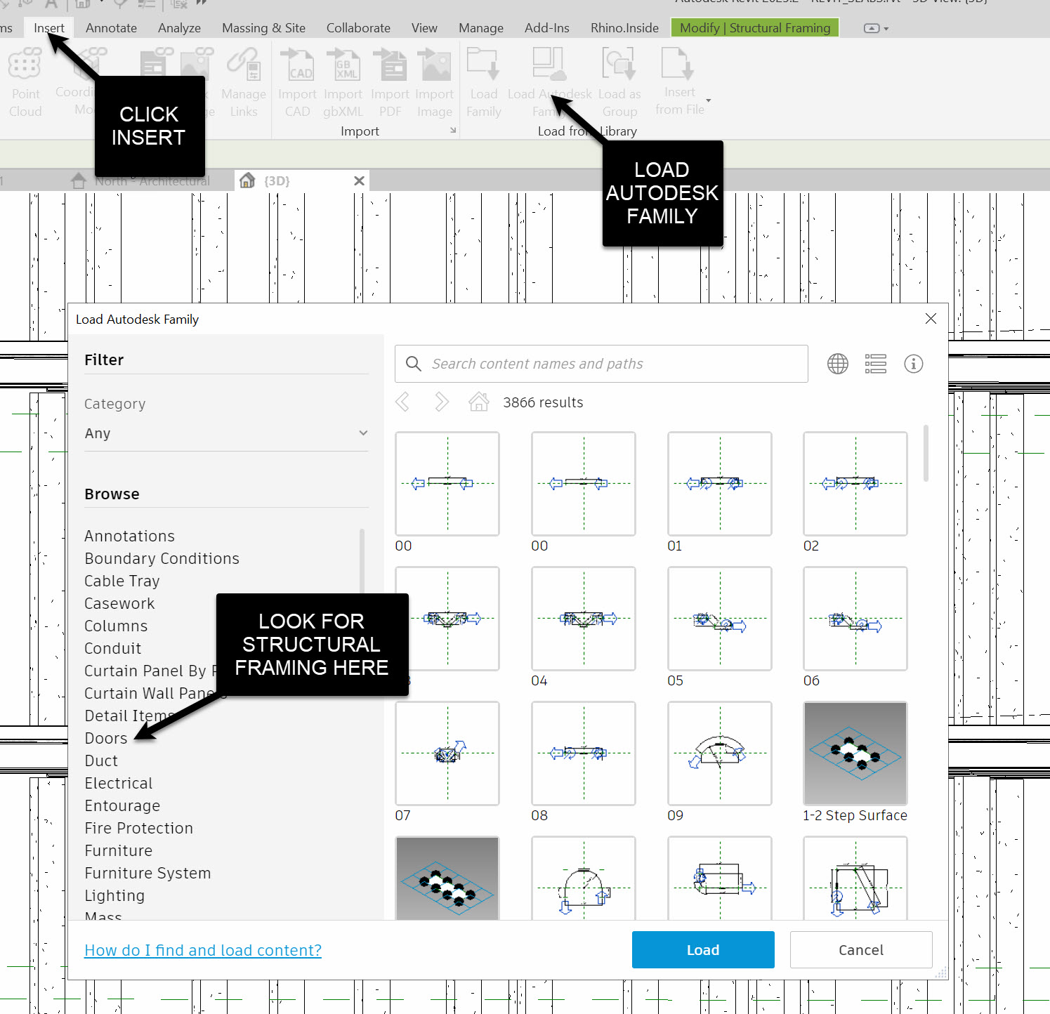 If you need to load families, do it in Revit first (Insert → Load Autodesk Family → Structural Framing → Concrete → Rectangular).
