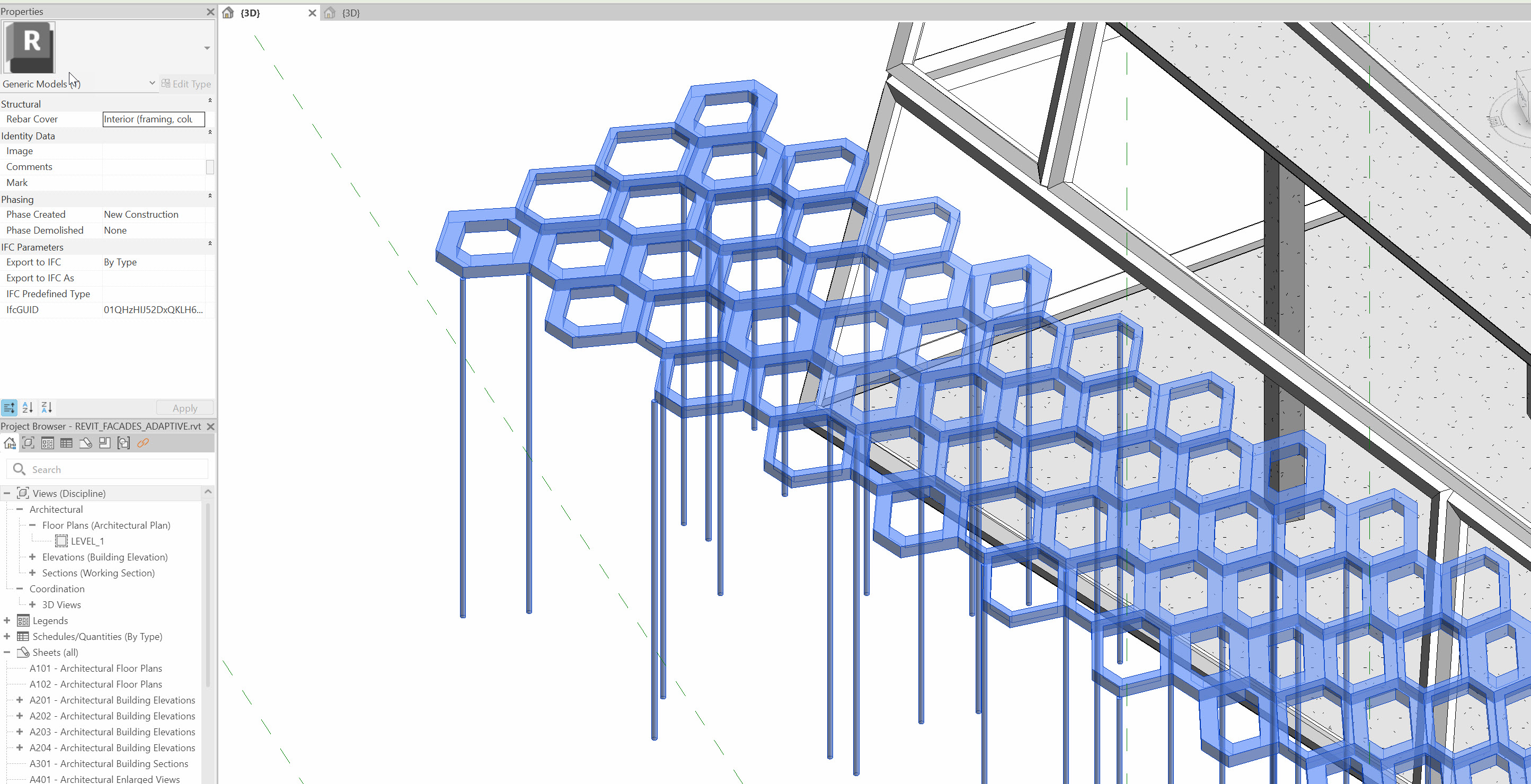 For this demonstration, I’m using a simple Grasshopper script that produces a canopy structure—a hexagonal surface with openings and a set of irregular supporting columns. Could you model this natively in Revit? Technically yes—using a combination of adaptive components, structural columns, and pipes—but it would take far longer than it's worth at this stage of design.